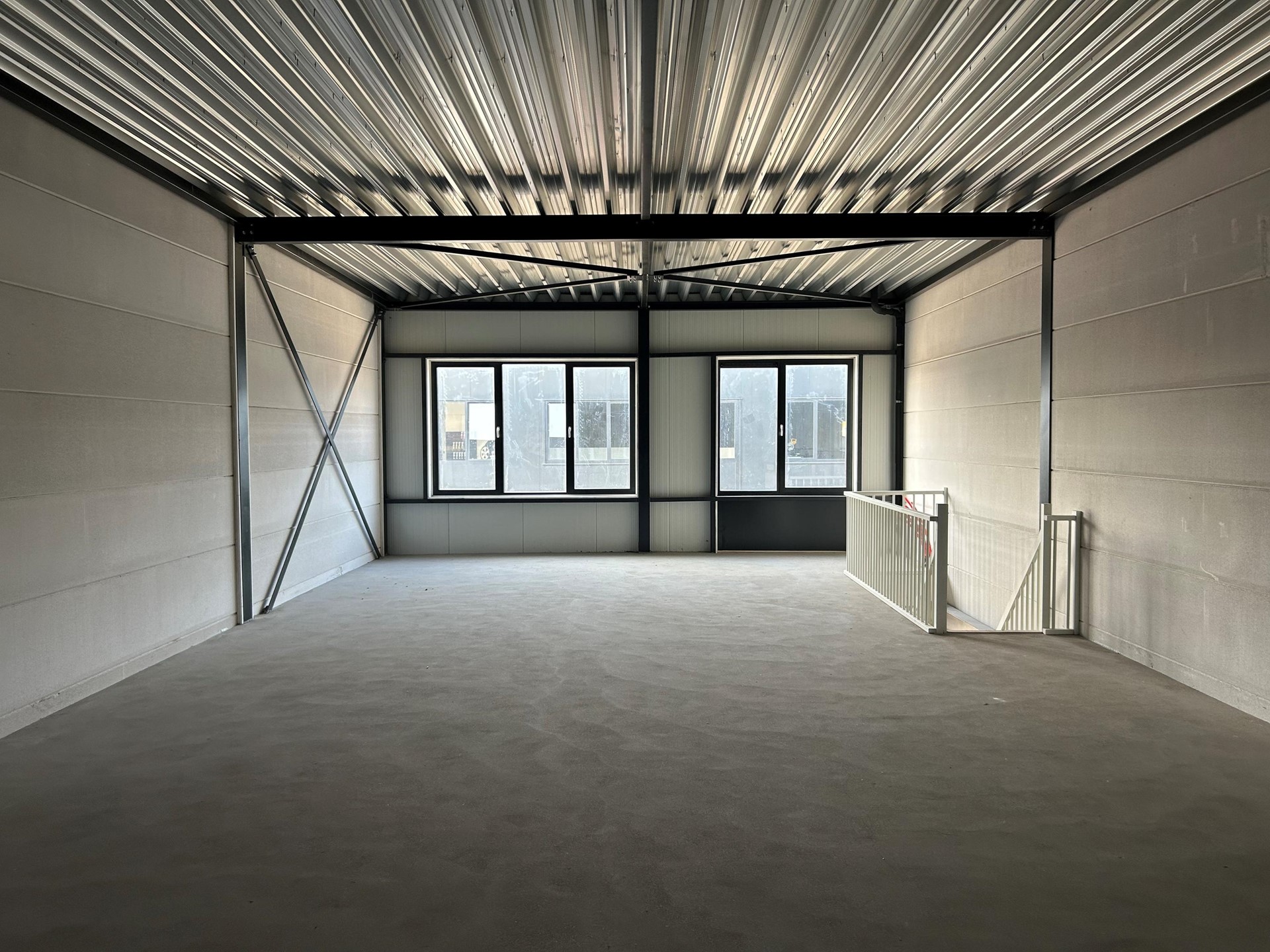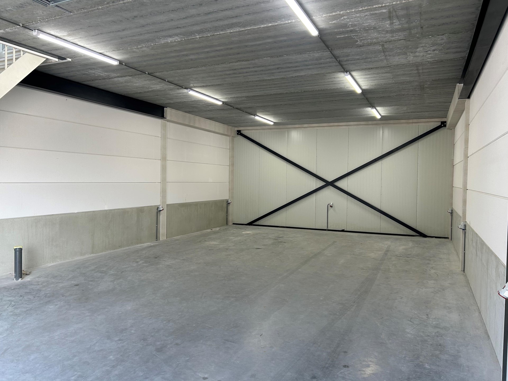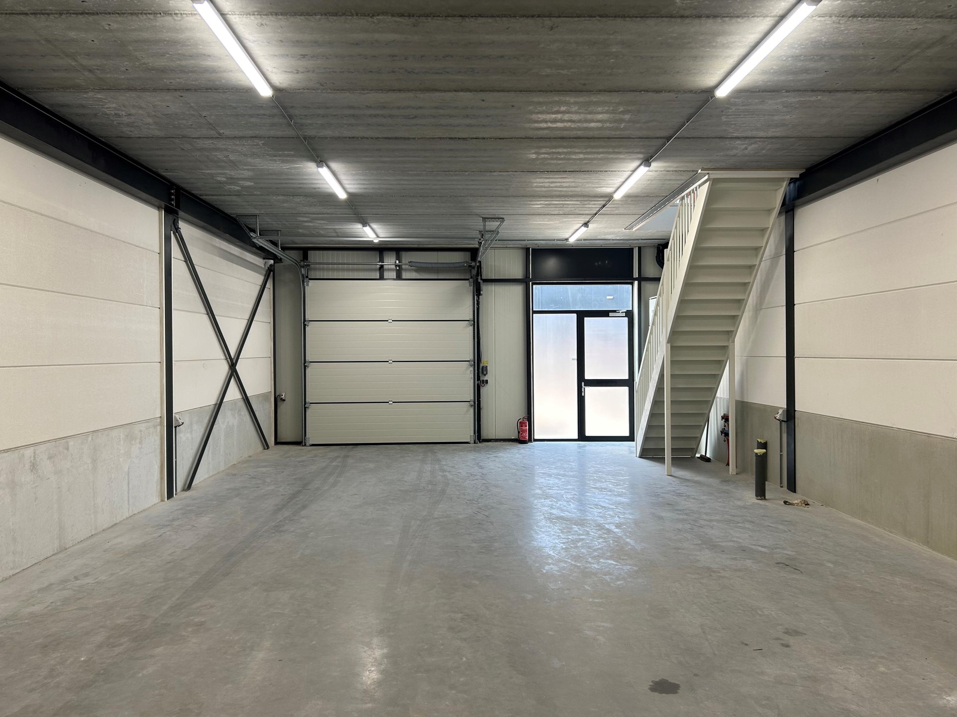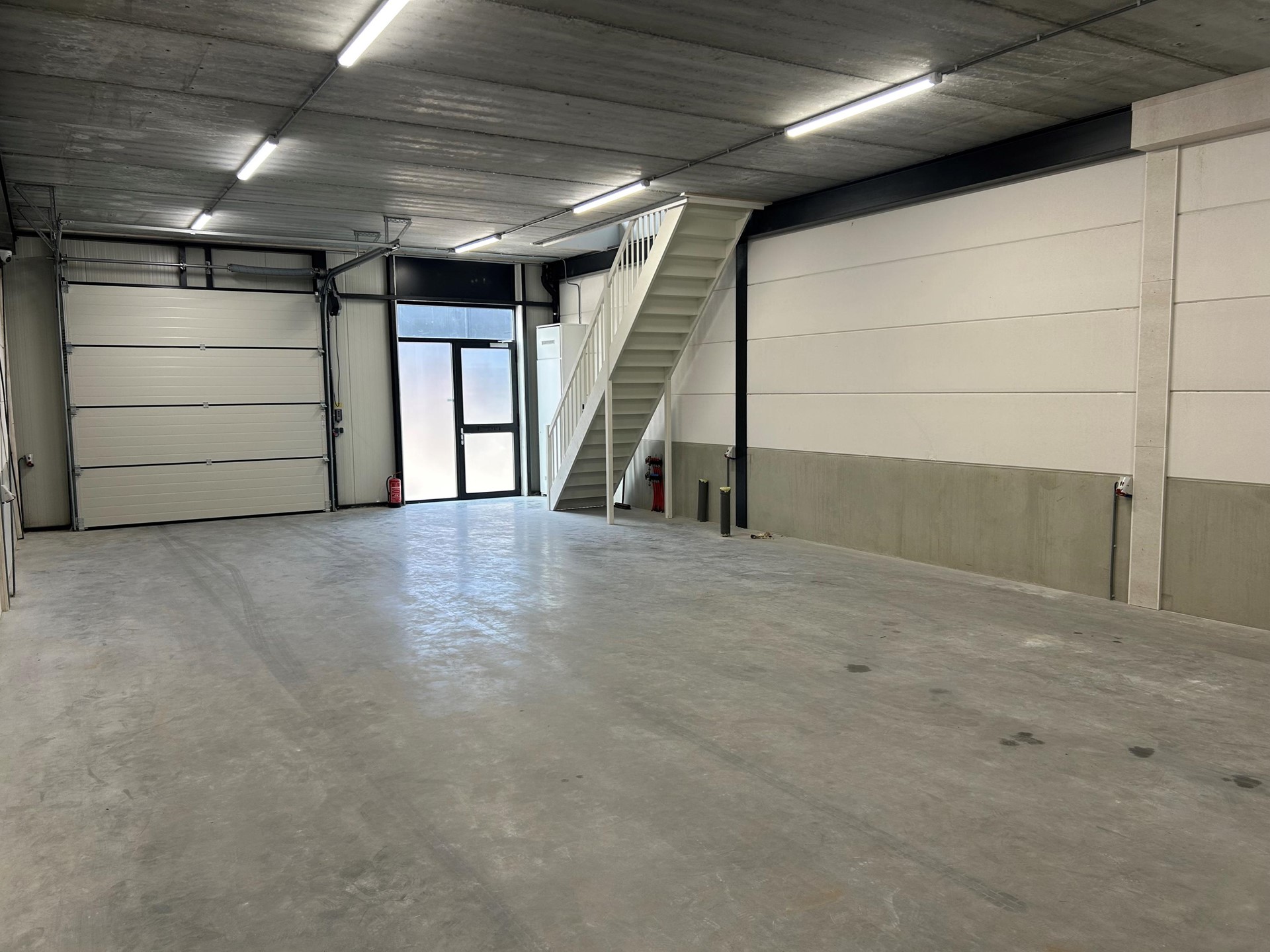 De toegang tot de bedrijfsunit verloopt via een loopdeur en overheaddeur, met een trapopgang naar de eerste verdieping.
