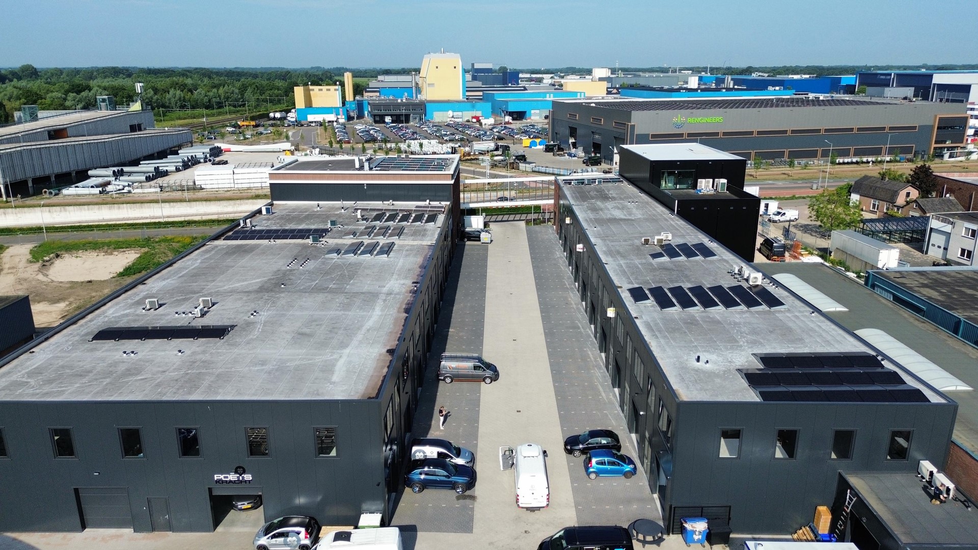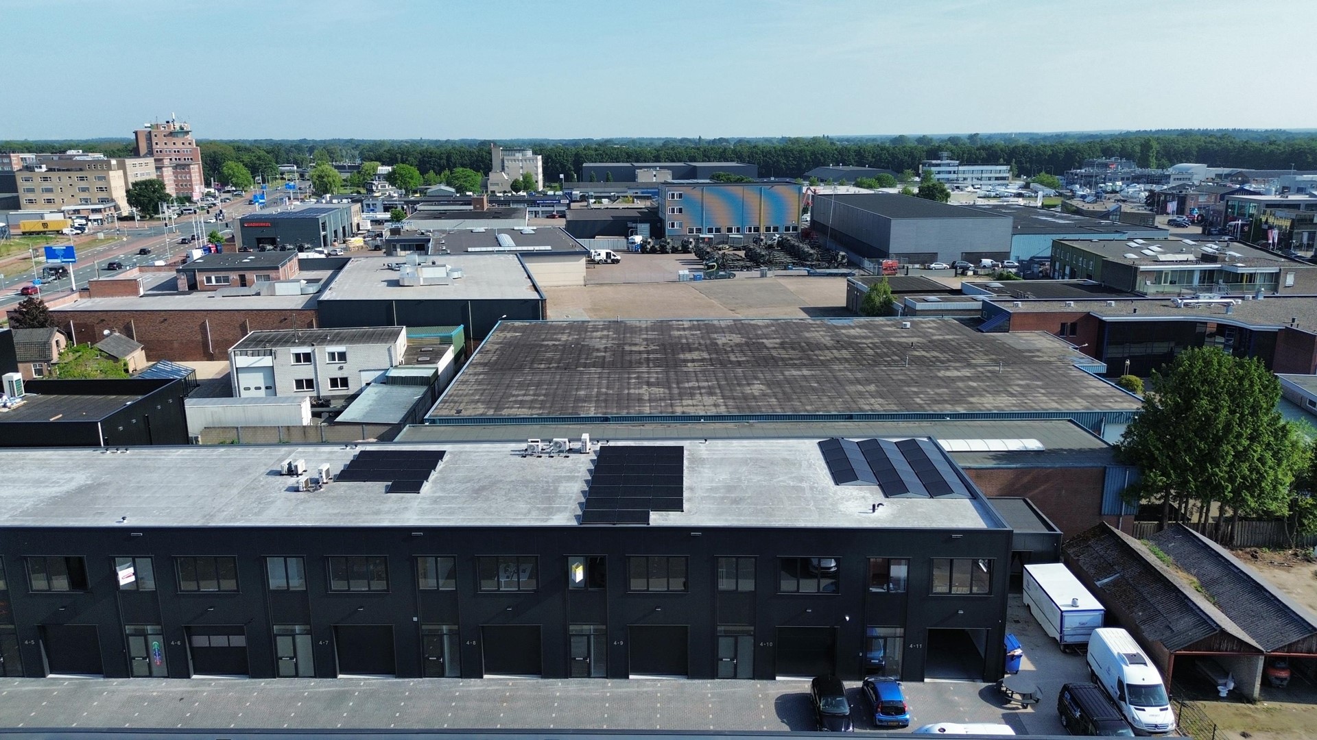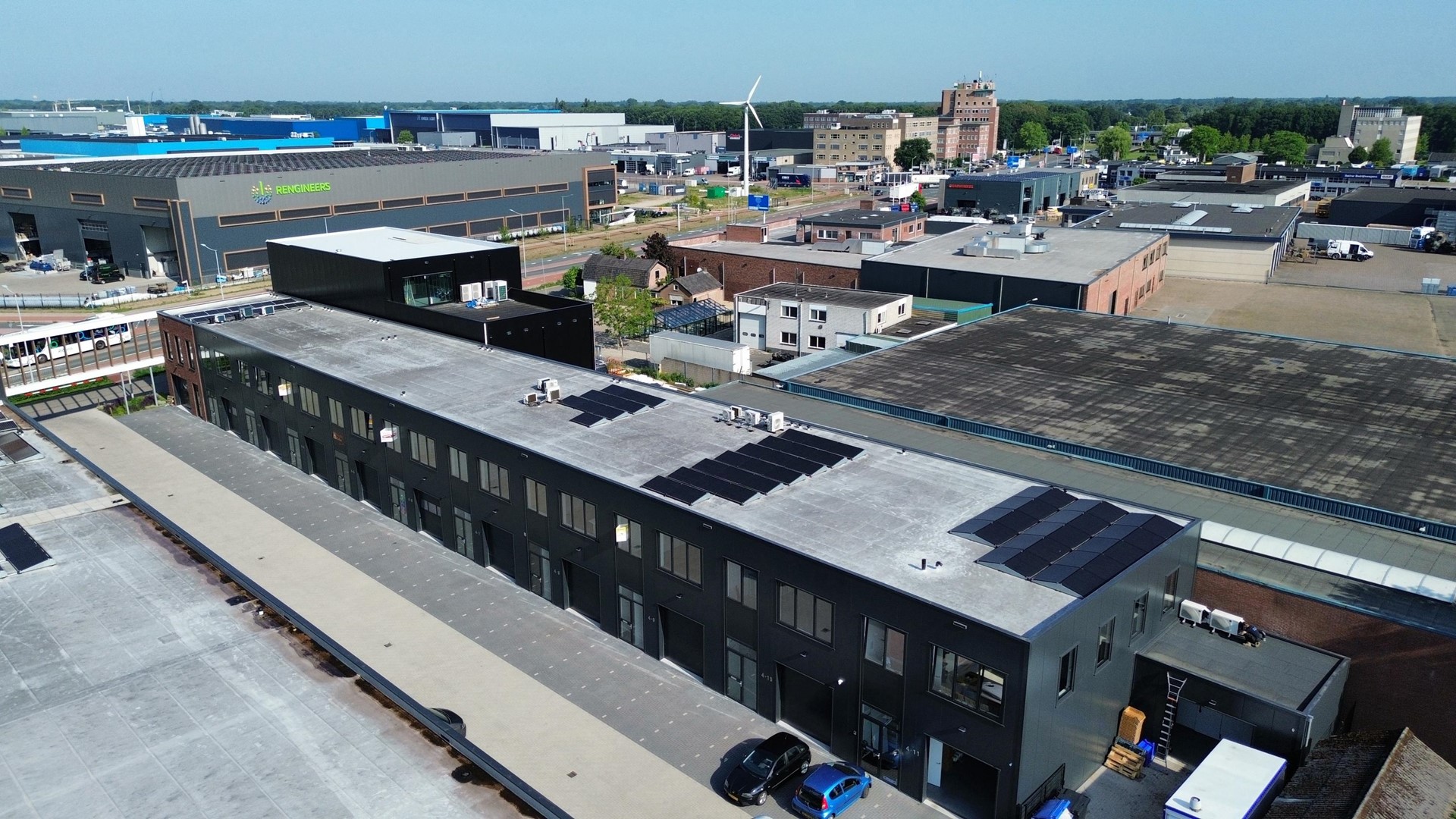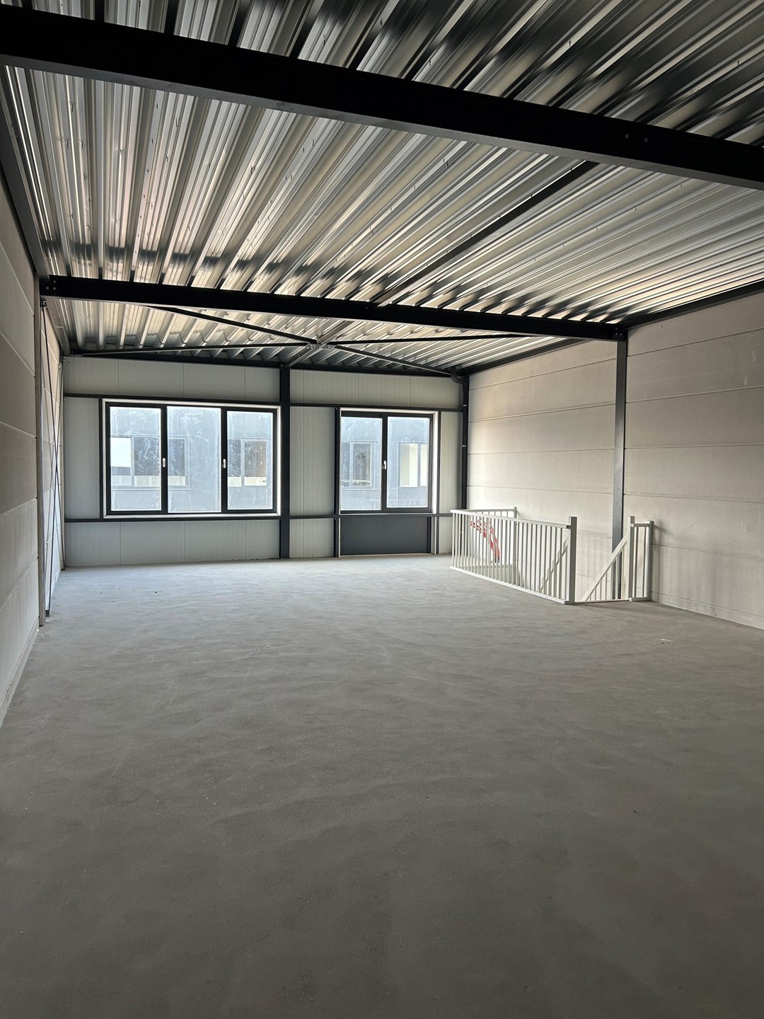 De toegang tot de bedrijfsunit verloopt via een loopdeur en overheaddeur, met een trapopgang naar de eerste verdieping.