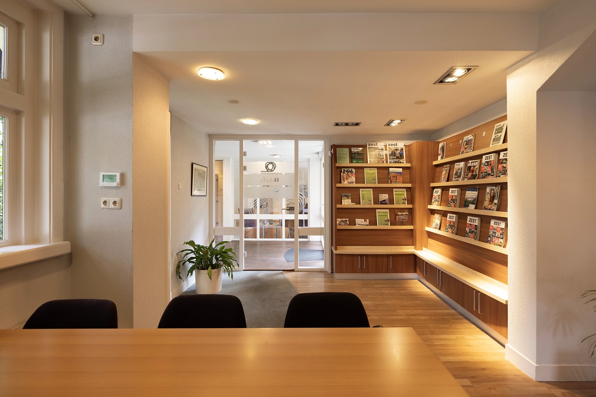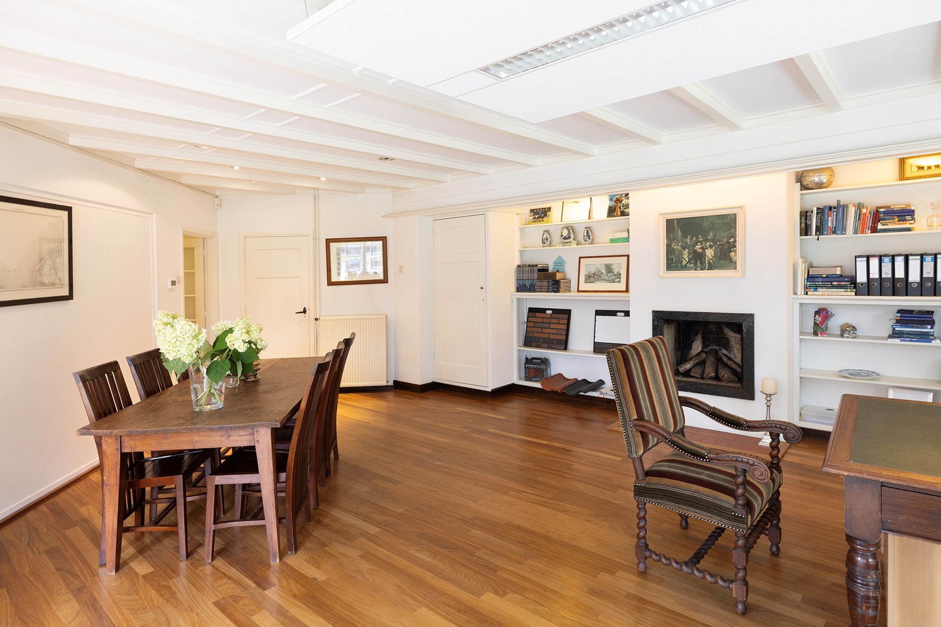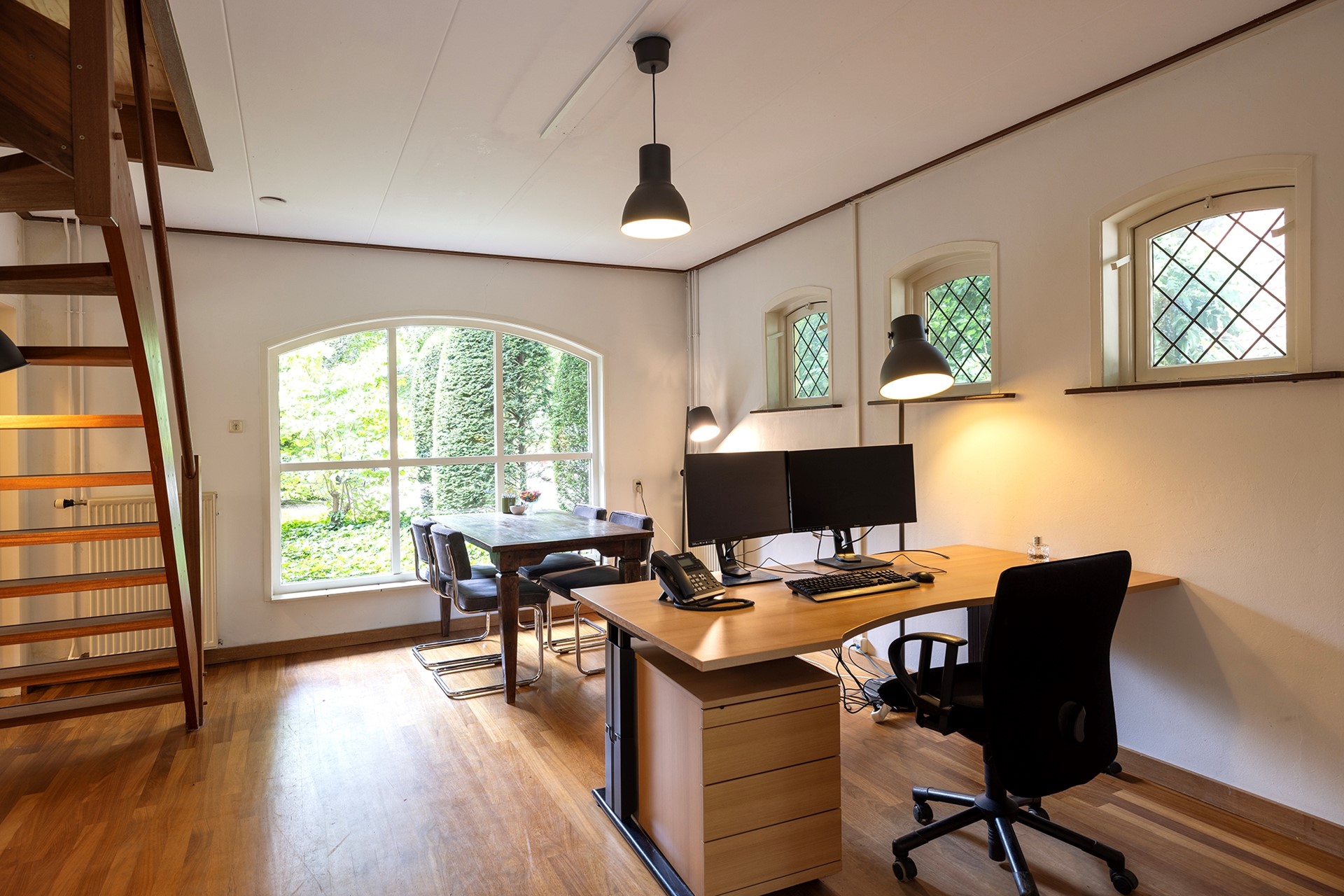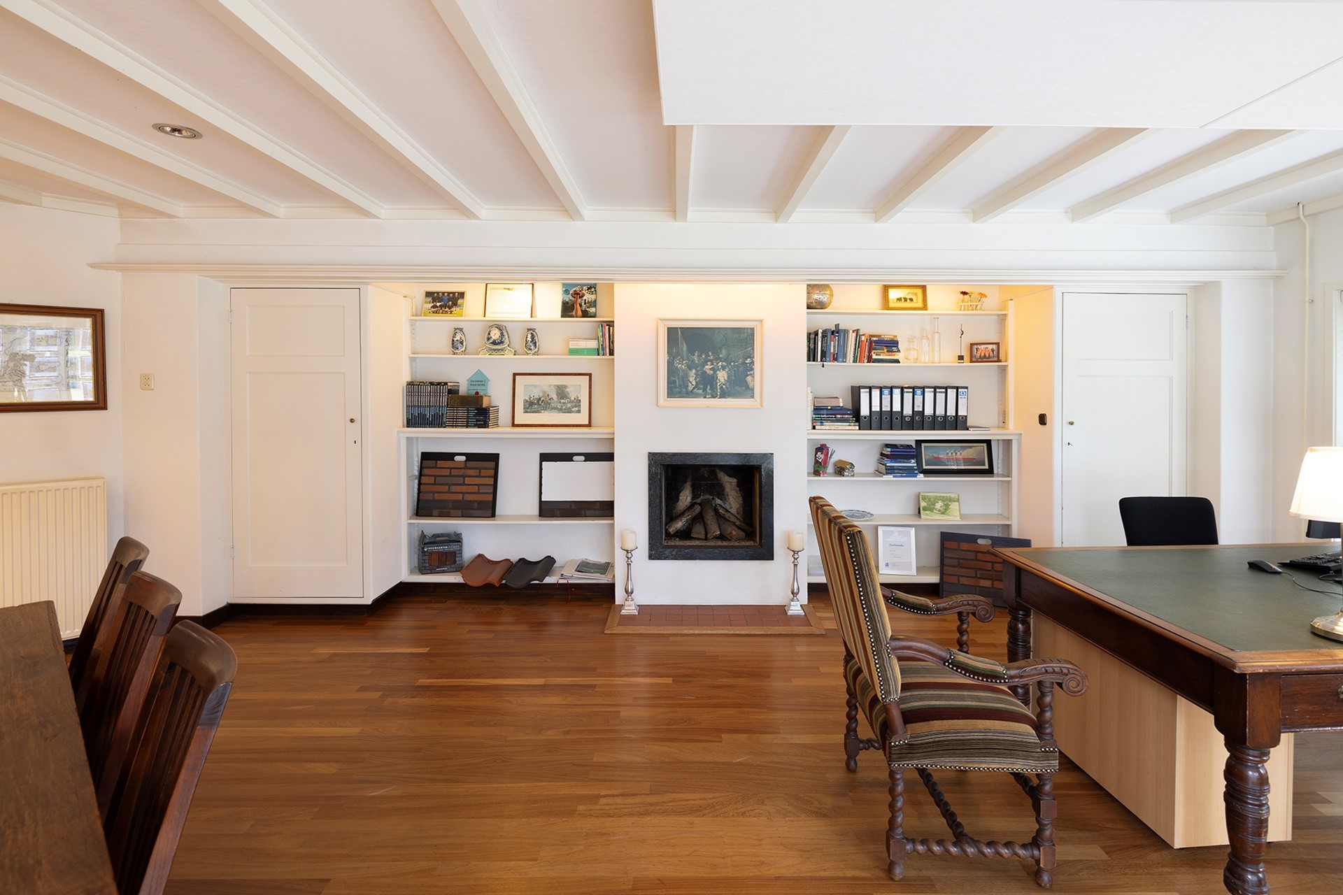 Aan de achterzijde is eveneens de eigen ingang terwijl aan de voorzijde de beide panden aan elkaar zijn verbonden door de gezamenlijke entree. In deze entree is een toilet met fonteintje. De achteringang geeft toegang tot de eenvoudige keuken en het kantoor aan de achterzijde als ook de ruime werkkamer met schouw, open haard en symmetrische boekenkasten rondom de haard. Het derde kantoor bereikt u via de gang.