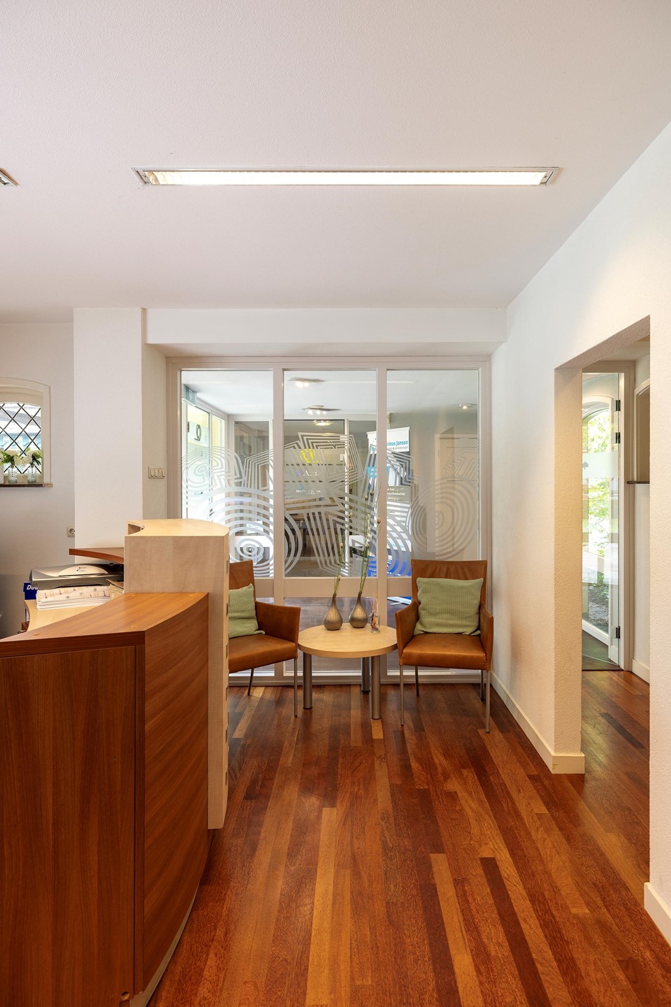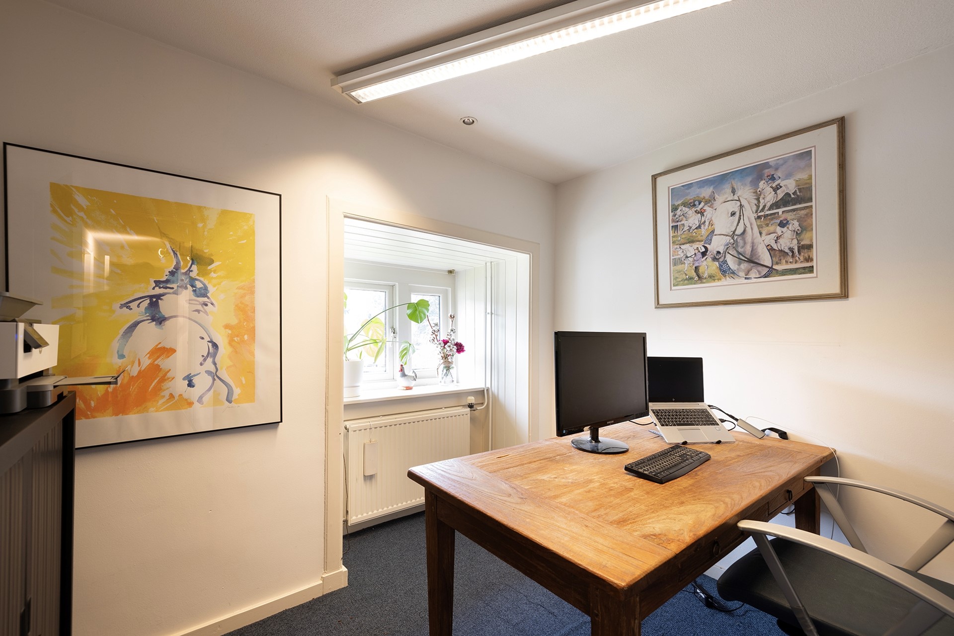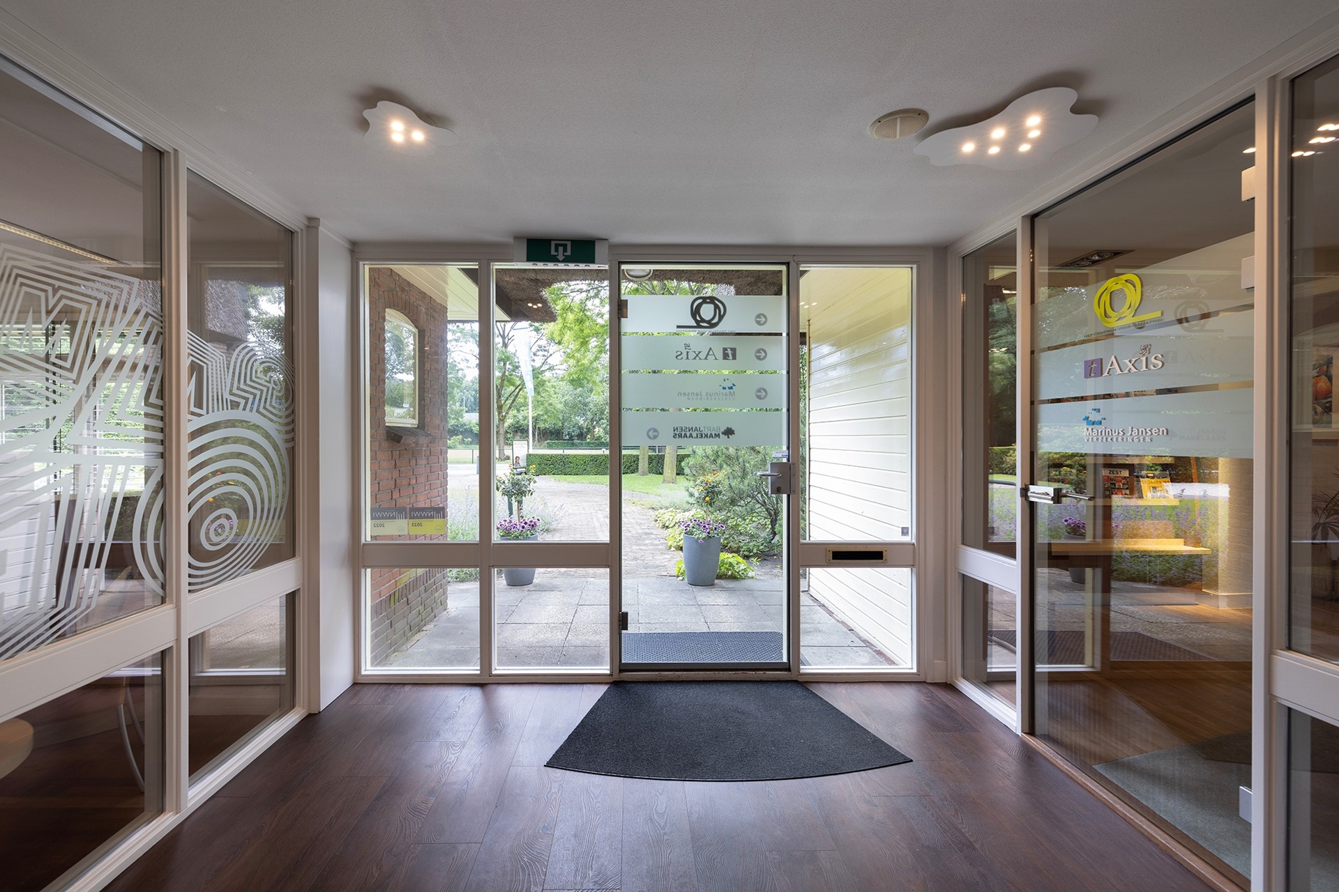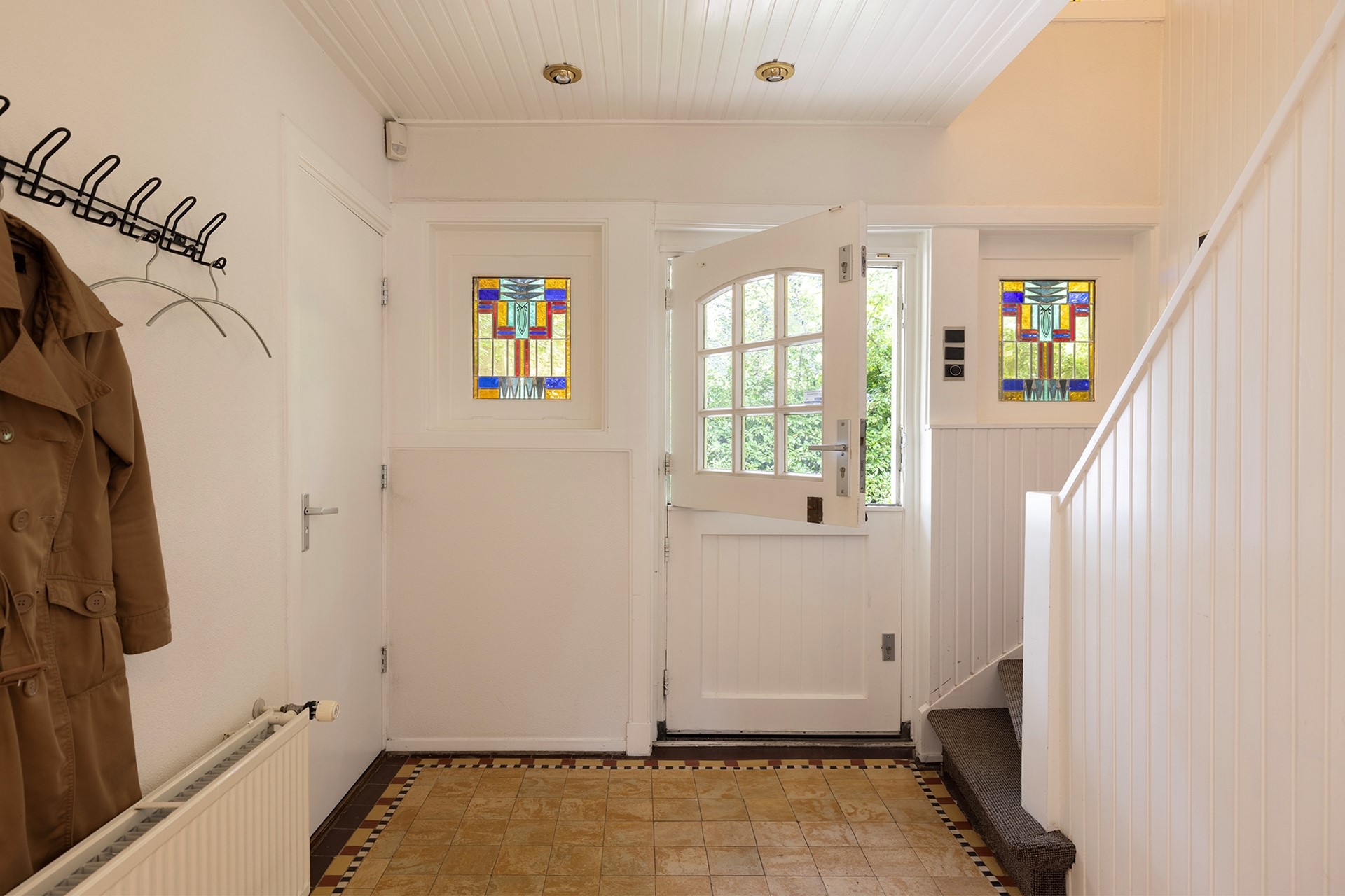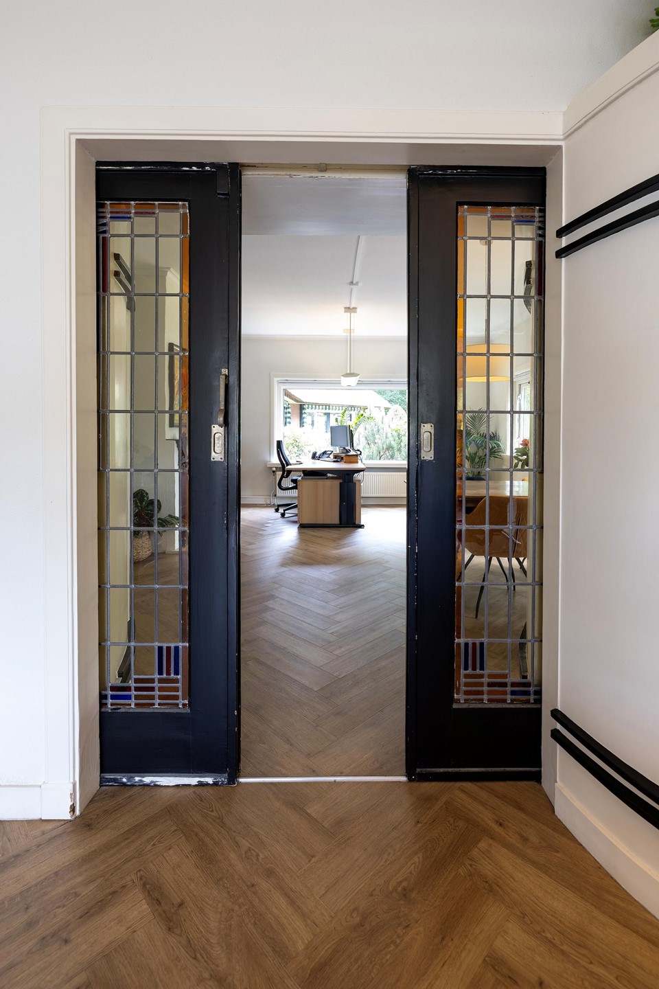 Aan de achterzijde is eveneens de eigen ingang terwijl aan de voorzijde de beide panden aan elkaar zijn verbonden door de gezamenlijke entree. In deze entree is een toilet met fonteintje. De achteringang geeft toegang tot de eenvoudige keuken en het kantoor aan de achterzijde als ook de ruime werkkamer met schouw, open haard en symmetrische boekenkasten rondom de haard. Het derde kantoor bereikt u via de gang.