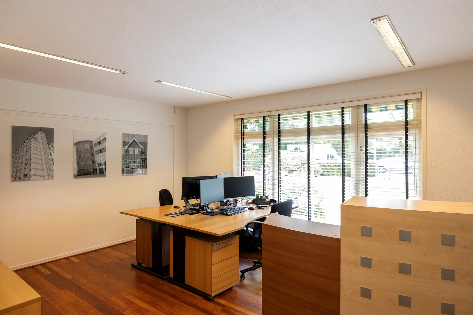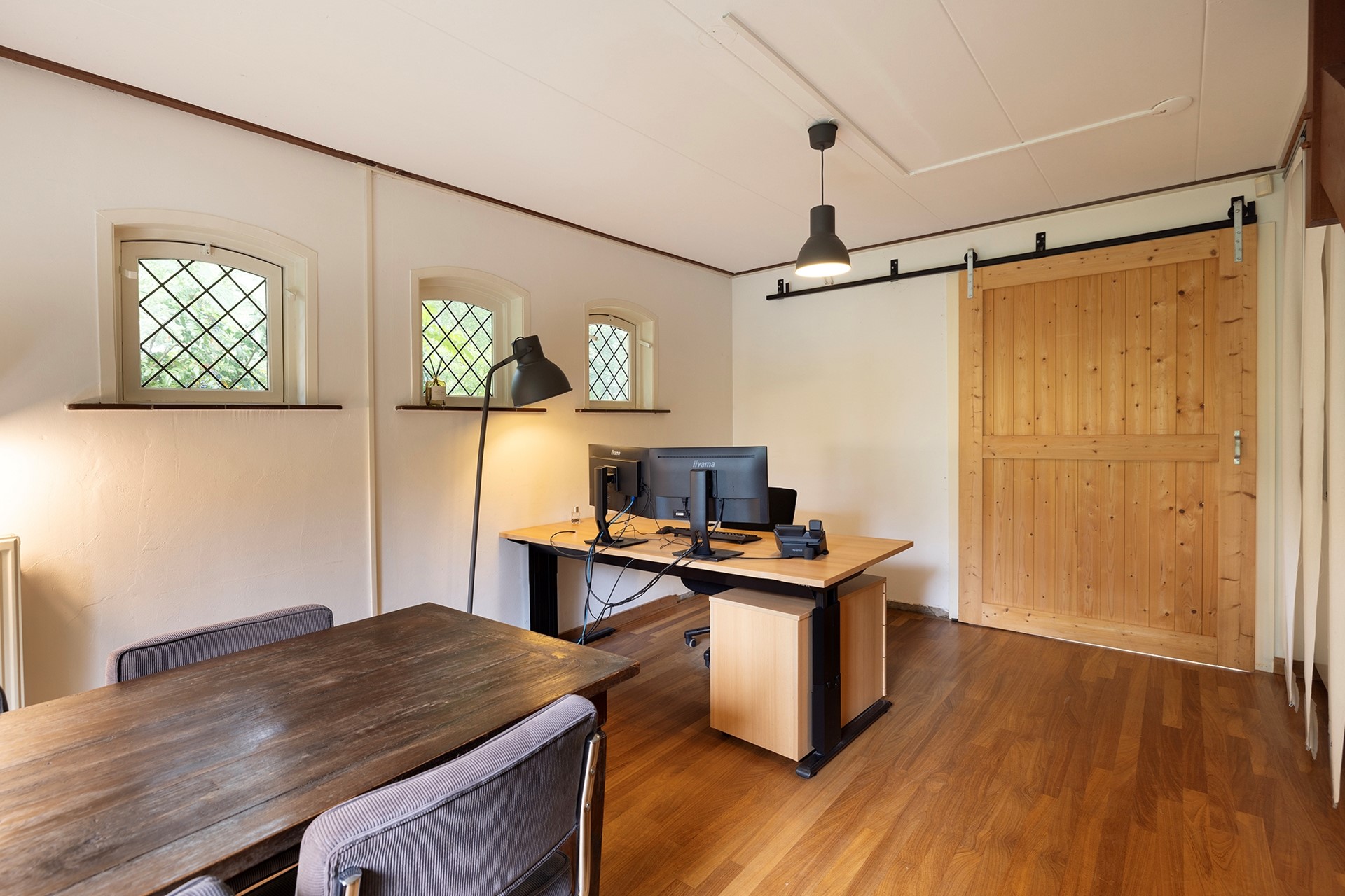 Het pand aan de Oranjelaan is gebouwd in 1929 en heeft een royaal oppervlak van 309 m². De karakteristieke voorgevel met deels houten bekleding en de rieten kap zullen u nieuwsgierig maken naar het interieur. Ook hier zijn authentieke elementen bewaard gebleven zoals glas in lood ramen, en suite deuren en houten balken plafonds. Zowel op de parterre als op de eerste verdieping zijn momenteel vier kantoren. De tweede verdieping is een grote zolder met verschillende nisjes, hier kunt u naar eigen idee en wensen de ruimte indelen.