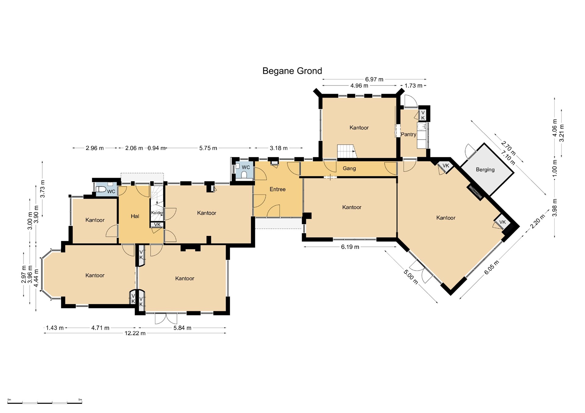 Aan de achterzijde van het pand is de entree. Via de voordeur komt u in de hal. Hier is het toilet met fonteintje en de opgang naar de eerste verdieping. Ook zijn alle ruimtes op de parterre toegankelijk vanuit de ruime hal met originele vloer. De eerste werkkamer heeft uitzicht op de Oranjelaan. De naastgelegen werkkamer met erker en vaste kast staat in verbinding door authentieke deuren en suite met de derde werkkamer. Hier treft u een schouw met open haard en rondom de deuren en suite is een prachtige ombouwkast voor uw bibliotheek. Via de openslaande deuren is direct toegang tot het terras. In de voormalige keuken en bijkeuken is het vierde kantoor ingericht. Hier is ook de toegang tot de kelder.