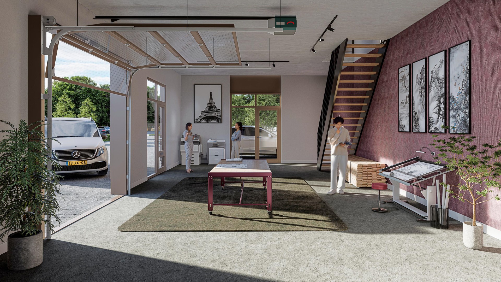 • overheaddeur en glazen loopdeur en plafondhoge ramen op de verdieping;