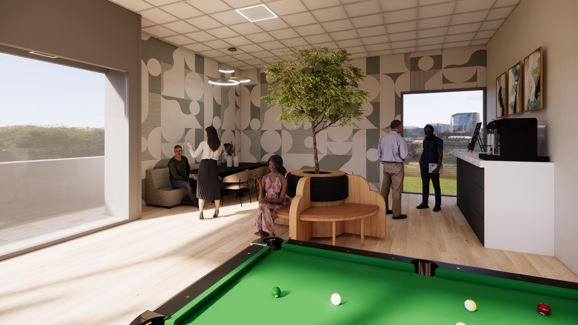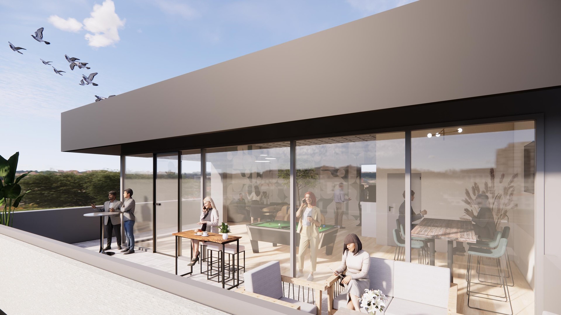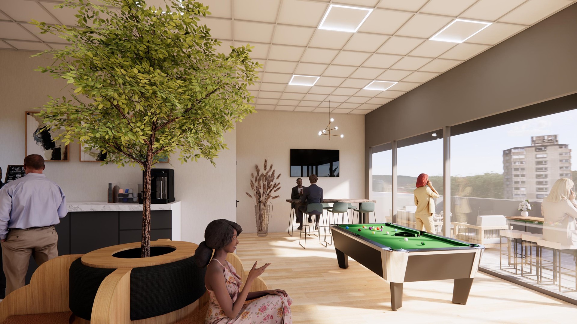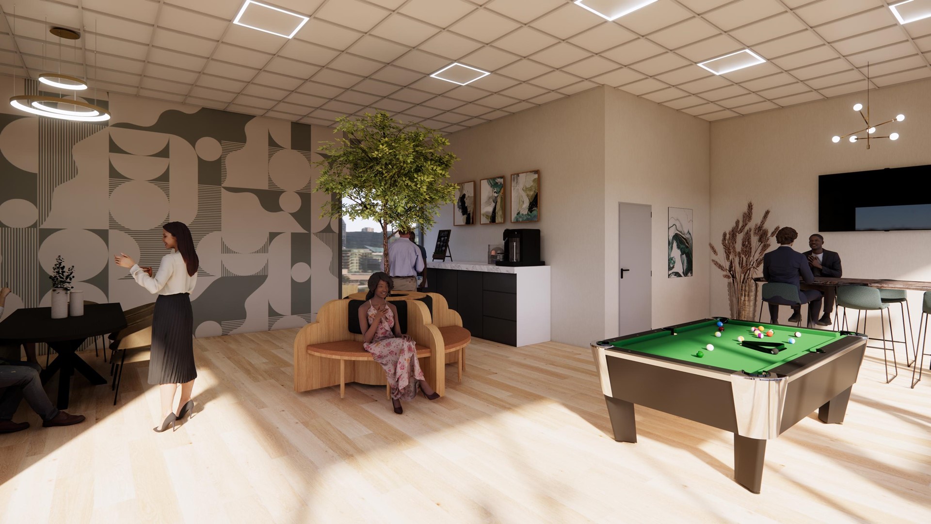 De tweede verdieping is een open en flexibel in te richten ruimte voor overleg, ontmoeting en ontspanning, met toegang tot het dakterras met uitzicht over de Nieuwe Singel. De verdieping functioneert zelfstandig en vormt een centraal ontmoetingspunt binnen het gebouw.